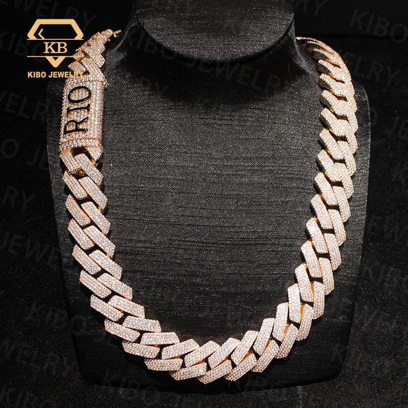 This custom hip hop necklace features a 20mm 925 silver moissanite Cuban chain, plated in 18K rose gold. Elevate your style with this iced out piece, perfect for any man looking to add some sparkle to their wardrobe. Made with high-quality materials, this necklace is a must-have for any jewelry collection.